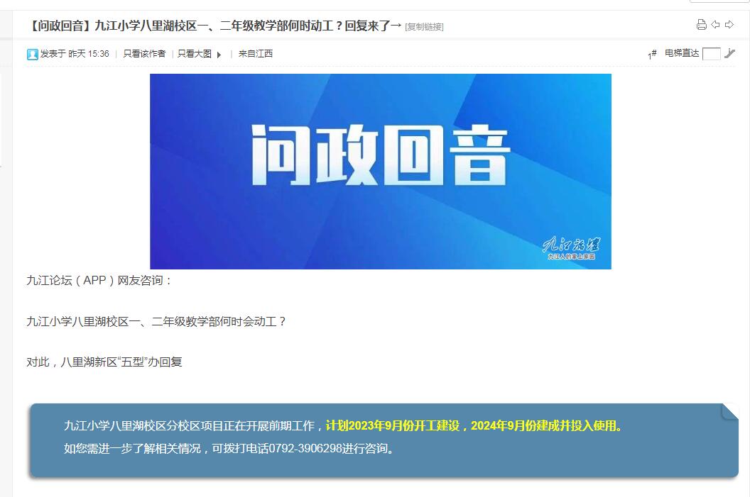 九江小學八里湖校區(qū)一、二年級教學部何時動工?回復(fù)來了→